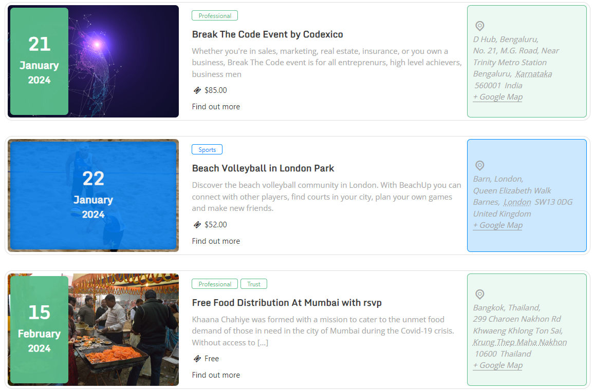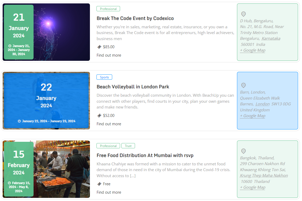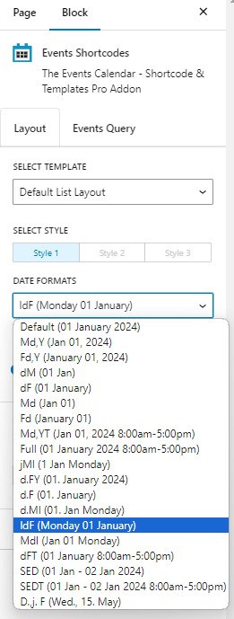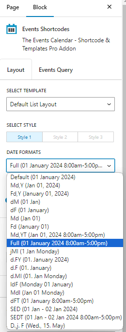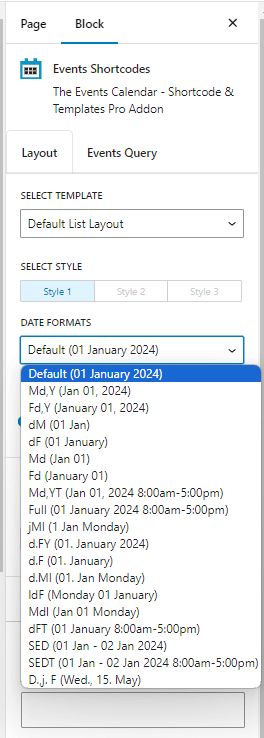 Events shortcodes pro plugin helps you to display your events with different date formats. Using our Date Formats setting in the shortcode generator or block settings you can select the format in which you want to show the event’s date. By default, the “default” option is selected to showcase the event’s date in default format i.e (01 January 2023).