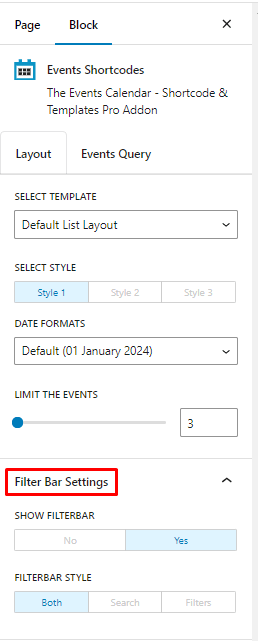 The Filter Bar allow site visitors to search for events using various filters. Below are the details on configuring Filter Bar settings: