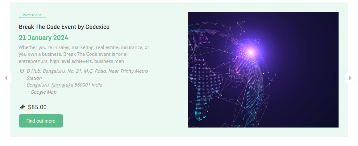 This template will help you showcase your events in form of a slider where each event is displayed as a slide.