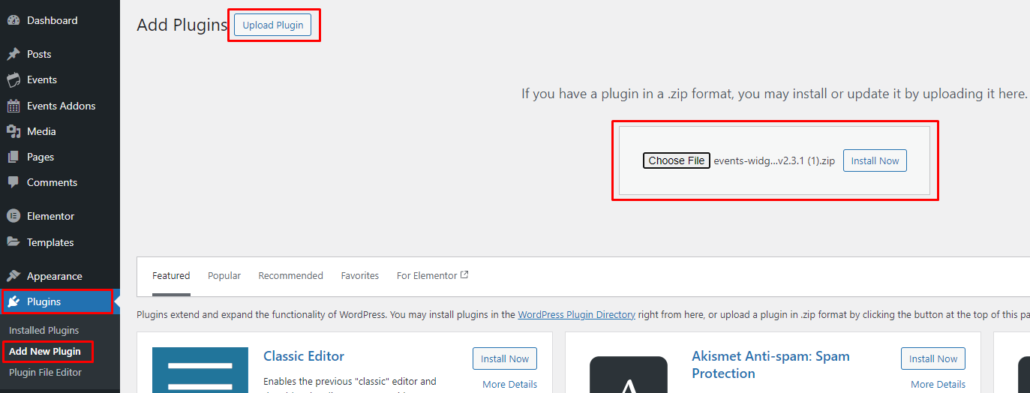 - Extract the main plugin file (.zip) to the folder and upload it to the server. For example, events-widgets-pro.zip to the events-widgets-pro folder and then upload to the server.