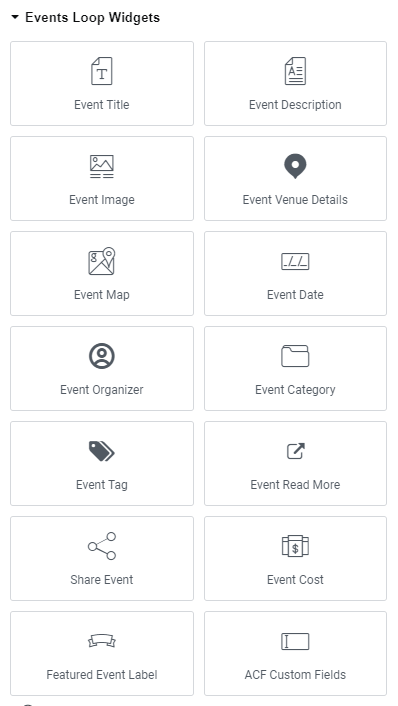 Event Loop Item Widgets are the widgets that display information about an event based on the provided widget settings. When creating a new loop item or editing an existing one, you can easily add or remove these widgets to customize the item according to your needs.