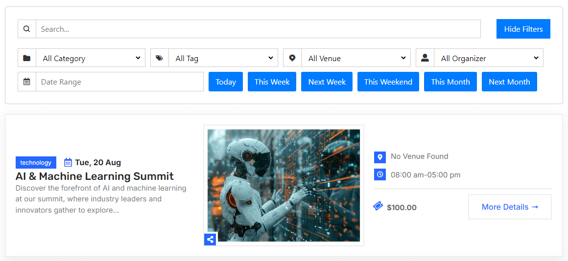 When the Search + Filters option is selected and the filters for Category, Tag, Venue, Organizer, Date Range, Today, This Week, Next Week, This Weekend, This Month and Next Month are enabled, the output will look similar to the screenshot below: