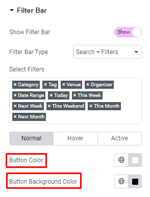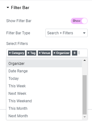 The Filter Bar settings allow site visitors to search for events using various filters. Below are the details on configuring these settings: